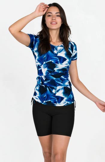 Stay comfortable and confident with this versatile swim set, featuring the Short Sleeve Adele Swim Top and Mid-Thigh Swim Shorts. The Adele top offers UPF 50+ sun protection, a round neckline, and adjustable side ruching for a flattering fit. Paired with the high-waisted mid-thigh swim shorts, this set provides full coverage, making it ideal for active days at the beach, pool, or lounging in the sun. The quick-dry fabric ensures all-day comfort, while the wide waistband on the shorts offers a secure and slimming fit.
