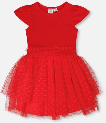 Charming and elegant, our bi-material dress in red brings together softness and flair for special days. This short-sleeved dress pairs a fitted bodice with delicate ruffle trim at the waist and a voluminous layered mesh skirt for a touch of magic. Crafted in a comfortable stretch polyester blend with airy mesh, this outfit is perfect for twirling at summer parties.