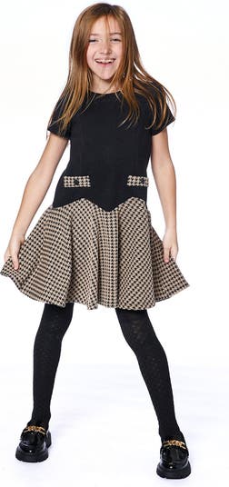 From school events to special occasions, this is the dress she can toss and go anywhere, at any time! An adorable look in a bi-material combination of Milano and jacquard knit fabric, this dress features a flared silhouette with a solid, short sleeve bodice, a round neckline, and a drop waist houndstooth skirt. Houndstooth welt pockets at the waist add the perfect finishing touch.