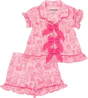 Pink Cottontail Toile Short Sleeve Bow Ruffle Pajama Set is a must-have for your little girl's bedtime wardrobe. Featuring a delightful pink toile fabric, this set includes a short-sleeve top with playful bow details and matching pajama bottoms enhanced with a cute ruffle trim. Perfect for toddlers and girls, this set is designed with an elastic waistband for a snug and comfortable fit. The fabric is gentle on sensitive skin, making it ideal for kids who need soft and snuggly materials. Plus, the breathable, 4-way stretch fabric ensures your child can move freely, whether she's sleeping or playing. The charming pink color paired with the toile print adds a touch of elegance to her nighttime routine. This pink pajama set for toddlers is not only stylish but also practical, offering a combination of comfort and durability for everyday use.