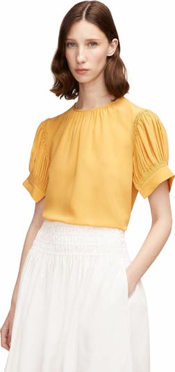 Gentle gathers and smocked detailing add romance to this silk crêpe de chine blouse.