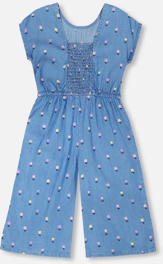 The chambray jumpsuit in blue with flower print is full of easy charm and soft movement. This one-piece features short sleeves, a round neckline, an elastic waist with drawstring, and practical slant pockets. Made from a lightweight chambray blend adorned with a delicate floral print, it combines comfort and elegance for every sunny-day outing.