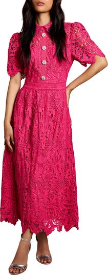 Exquisite all-over lace design with scalloped hem detailing. Elegant collared neckline with decorative button placket. Sophisticated puff sleeves adding a contemporary touch. Flattering midi length with defined waistline. Delicate keyhole back fastening for refined finishing. This stunning coast lace midi dress combines timeless elegance with modern detailing.