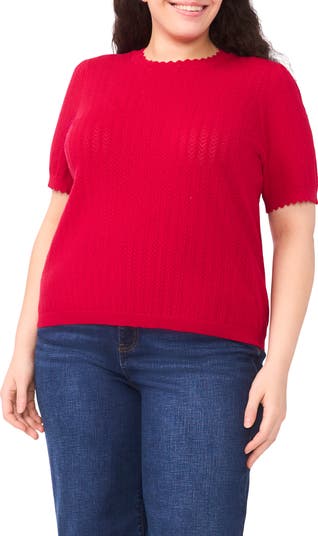 A scalloped neckline and cuffs sweeten this short-sleeve pointelle sweater knit from soft, lightweight cotton yarns.