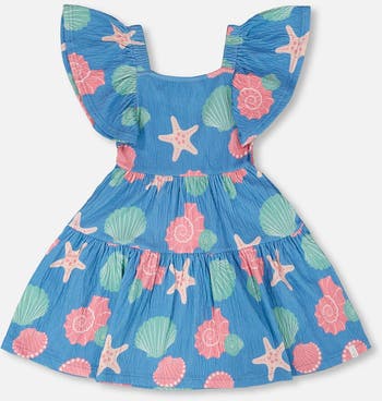 Our crinkle jersey dress blue with shell print is a cheerful style with a breezy summer feel. This A-line dress features a delicate allover print, a square neckline, short flutter sleeves, and tiered layers that create playful volume. The crinkle jersey cotton blend adds softness and stretch, making it an easy favorite from our "Blue Horizon" collection.