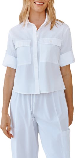 Woven in a light and breezy cotton blend, this shirt features utility pockets and a cropped length for an on-trend update to a classic style.