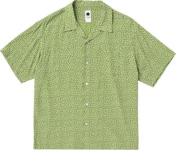 An open-collar shirt made from elegant rayon crepe fabric with a refined drape, featuring hidden animal motifs and brand lettering.