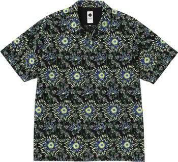 A short sleeve open collar shirt made featuring graphic embroidery