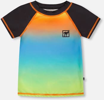 This short sleeve rashguard in orange blue and green gradient brings vibrant color to swim days. This rashguard features a striking ombré effect shifting from orange to blue to green, accented with short contrast sleeves and a small front logo. Made from recycled polyester with added stretch, it provides comfort, quick-drying performance, and sun protection for boys and baby boys.