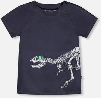 This short sleeve rashguard in black combines cool style with sun-ready protection. This swim top features short contrast sleeves and a bold front print of a dinosaur skeleton wearing sunglasses, crafted from recycled polyester with stretch for comfort and easy movement. Quick-drying and lightweight, it keeps boys comfortable during long days of water play.