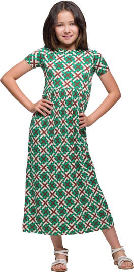 A vibrant statement piece that is sure to brighten her day with its beautiful green geometric print. Featuring playful short sleeves and an ankle length silhouette, this dress balances casual elegance with comfort effortlessly. The classic round neckline and pleated waist add a touch of sophistication, making it suitable for any occasion, from playdates to family gatherings. Whether she is twirling in the garden or enjoying a special occasion, this dress promises to be her top choice for style and ease.