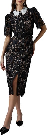 Exquisite lace overlay with intricate floral pattern. Contrasting white collar for a striking visual effect. Elegant midi length with a sophisticated side slit. Short puff sleeves with delicate scalloped edges. Button-down front for a classic shirt dress silhouette. This stunning lace shirt dress from coast is the epitome of refined elegance. The intricate floral lace overlay creates a captivating visual texture, while the contrasting white collar adds a touch of sophistication.