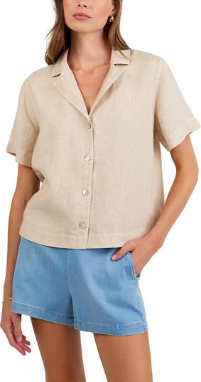 A boxy fit complements this breezy linen camp shirt designed with short sleeves and a notched collar for weekend-ready wear.