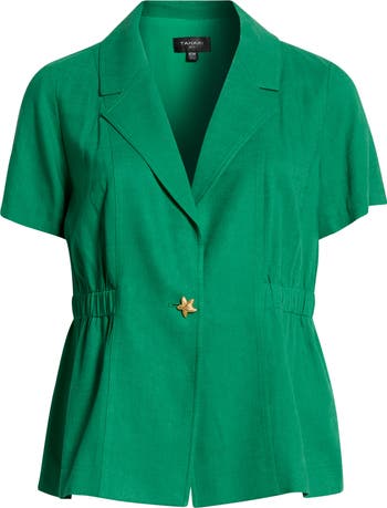 A back elastic waist shapes the silhouette of this lightweight linen-kissed jacket framed by abbreviated sleeves and fronted with a golden starfish button.