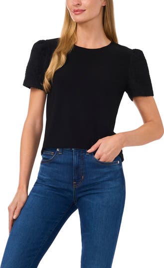 Perfect for the office and beyond, this mixed-media top offers polished style with a soft crepe body framed by tweed-like bouclé sleeves.