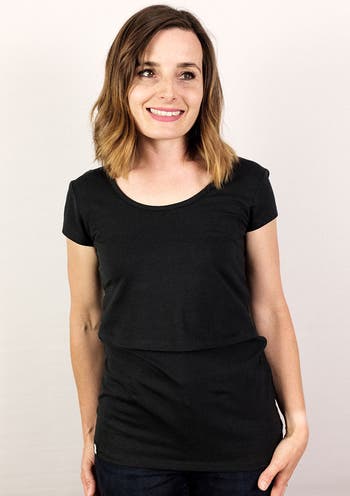 Designed with breastfeeding mums in mind, this t-shirt sleeve top offers a comfortable fit that allows for ease of movement while nursing. The design promotes a natural breastfeeding position, which is beneficial for milk flow and your baby’s well-being, helping to make each nursing session a more relaxed experience. This versatile black t-shirt offers all-day comfort with a gentle hand feel that’s both eco-friendly and sustainable. Whether you’re running errands or spending a day at home, this essential breastfeeding piece combines style, comfort, and functionality, ensuring it’s a perfect addition to your nursing wardrobe at every stage of motherhood.