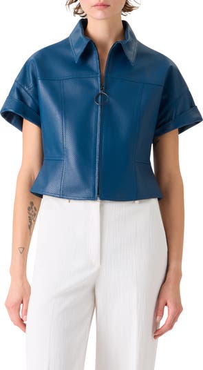 Short Sleeve Perforated Lambskin Leather Crop Jacket