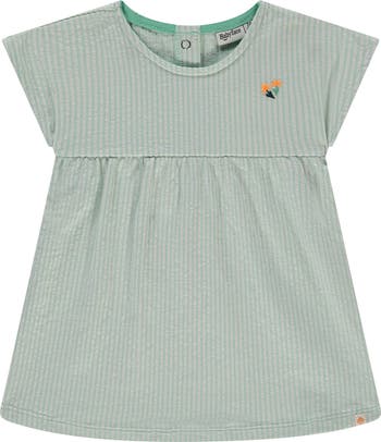 This short sleeve dress features an allover stripe pattern, flower applique accent, and peplum accent below the bodice.