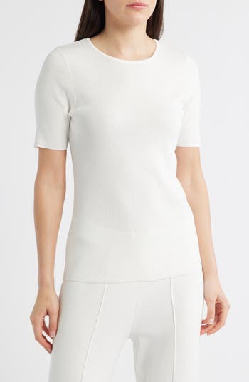 A polished fine-gauge sweater is updated with abbreviated sleeves for work-to-weekend versatility.