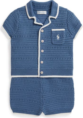 Baby will be relaxed, comfy and coastal-cool in this chunky cotton set featuring a tipped, polo-inspired sweater and pull-on shorts.