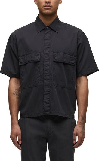 Purposefully rumpled fabric and prominent chest pockets lend a rugged, utilitarian vibe to this short-sleeve button-up finished with signature V-shaped back seams for a tailored touch.