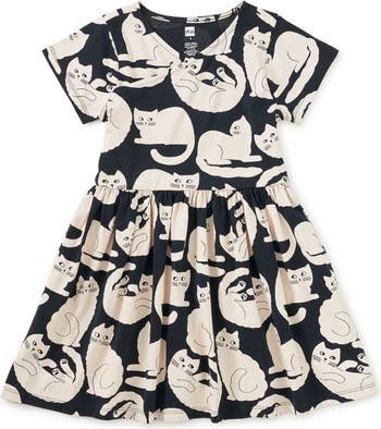 An everyday favorite with timeless appeal. This Short Sleeve Wrap Neck Dress features an artist-drawn cat print, created in-house to add a playful, storybook feel to a classic, easy-to-wear silhouette. Thoughtfully made for comfort and movement, it's designed to be worn often, washed well, and loved long enough to pass along. Crafted of soft 100% cotton jersey, it features a wrap neckline, short sleeves, and a gently gathered skirt for extra twirl. Pair with leggings or Somersault Shorts for play-all-day versatility.