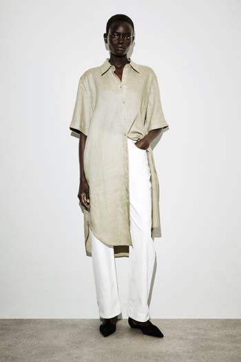 This boxy shirt dress offers an understated take on summer dressing. Available in a rich burgundy tone, it's crafted from linen that's naturally lightweight and designed with a pointed collar, short sleeves, and a box pleat at the back for volume.