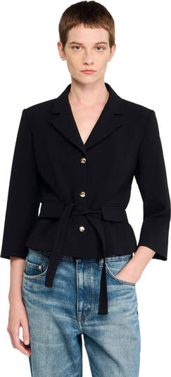 Short belted jacket with a topstitched lapel collar, long sleeves, and welt flap pockets.