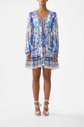 Inspired by Dolmabahçe and Çırağan Palaces, the Ottoman Opulence Short Tie Front Blouson Dress is a handcrafted silhouette designed by our in house artisans. Reimagined in an exclusive limited edition print, this dress features an adjustable tie front that flows into a flared skirt, sitting just above the knee. Long blouson sleeves are finished with elasticated cuffs and it's adorned with crystal embellishment, bringing a luminous touch to every gesture.