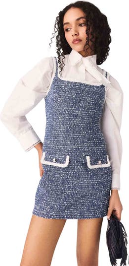 Set a course for structured, modern femininity, inspired by the contrasting styles of the yacht club, where marled blue tweed is both essential and sophisticated.This short dress, made from marled blue cotton tweed, features a straight, fitted cut, a square neckline and contrasting trim that accentuates every line. Two patch pockets, adorned with round silver-tone buttons, add a couture touch. The white lining and wide straps ensure comfort and support.For a bold, refined look, pair it with a white pussy-bow blouse, patent leather loafers and a mini M bag.