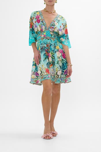 Designed in Australia, The Gardens Of Queluz Short Waisted Dress is inspired by the romantic and forever artful Queluz Palace Lovingly handcrafted, this elegant silk mini dress features a soft voluminous bodice that cinches into an adjustable shaped waistband detail. The skirt softly gathers and drapes into a flare at mid thigh and the batwing style ruffle sleeves create decadent drape at elbow length.