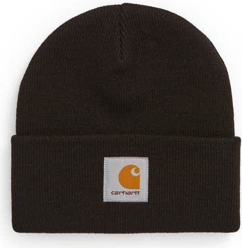 An unmistakable logo patch marks the turned-up cuff of a short knit beanie that offers no-nonsense warmth.