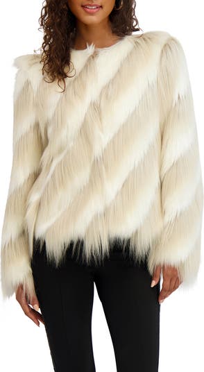 Put a glamorous finishing layer on your cold-weather ensembles with this wispy, diagonally quilted faux-fur jacket cut with powerfully pronounced shoulders.