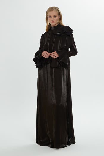 Gizia Shoulder Ruffle Detailed Shiny Black Dress, Alternate, color, Beige