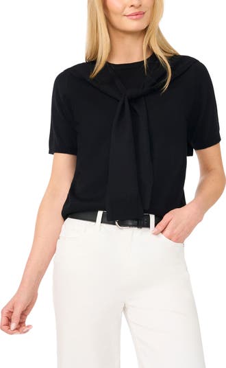 Achieve a two-piece look with this preppy short-sleeve sweater designed to look like it has a second layer draped and tied around the shoulders.