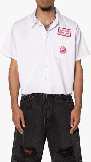 Be the hippest looking guy in the pits wearing this crisp cotton sport shirt featuring a checkered-flag graphic and embroidered patch.