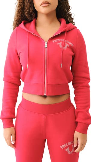 Signature logos shaped from rhinestones add a spark of glamour to this cozy cropped hoodie.
