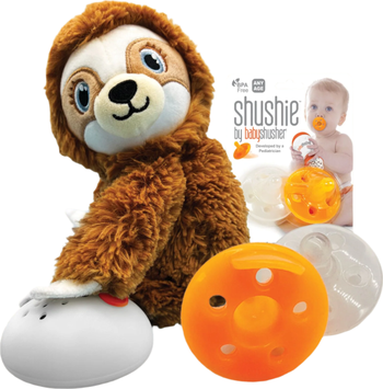- Shusher Sloth Trusted Shushing Sound: Emits the same calming "shhh" sound as the original Baby Shusher to soothe and sleep train your baby. Smart Noise Detection: Listens for your baby's cries for up to one hour after shushing ends. If noise is detected, it restarts the sound for another hour, followed by an additional hour of noise detection. This cycle is ideal for little ones who wake easily and supports sleep training. Portable Design: Powered by two AA Duracell batteries, it�s perfect for car seats, strollers, cribs, and playdates. Easy to Use: Simple one-button operation. Press once to turn on, and hold to adjust volume. Versatile Attachment: Soft hook-and-loop hands make it easy to attach to cribs, strollers, or car seats. Machine Washable: Easily washable (remove the sound module before cleaning). Batteries Included: Comes with 2 AA Duracell batteries�ready to use! 2-Pack Shushie Silicone Pacifiers Safe & Comfortable: Made from 100% hospital-grade, BPA-free silicone. Breathable Design: Extra ventilation holes prevent chafing and ensure airflow. Pediatrician-Approved: Supports natural sucking reflex and healthy dental development. Easy to Clean: Dishwasher safe or boil to sterilize. Bundle Benefits: Cuddle & Soothe: Shusher Sloth calms with sound while Shushie Pacifiers provide gentle comfort. Smart Comfort: Noise detection automatically restarts shushing if your baby cries within the hour of noise detection. User-Friendly: Simple operation and adjustable volume for ease of use. Safe & Durable: Baby-safe materials ensure peace of mind. On-the-Go Comfort: Lightweight and portable for use anywhere.