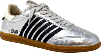 Bold stripes and faux-suede overlays amplify the retro style of this sporty bike-toe sneaker grounded by a grippy waffle-textured sole.