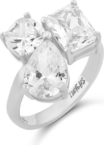 A trio of bold stones gleam atop this statement-making cocktail ring crafted from sterling silver or 14-karat-gold plate.