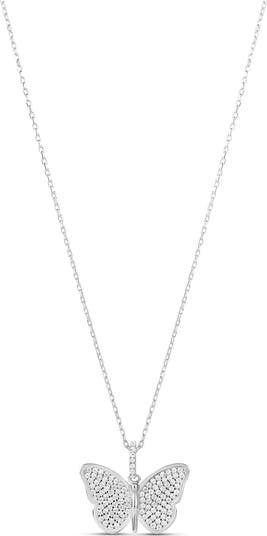 Cubic zirconia pavé illuminates the wings of the butterfly pendant in this whimsical necklace.