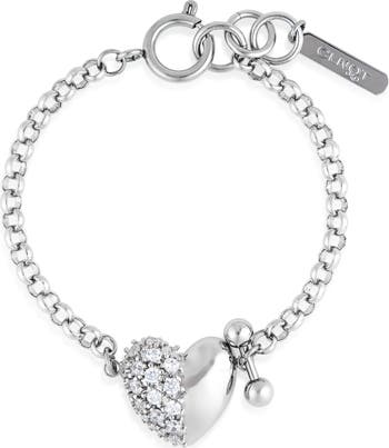 A barbell piercing brings the label's signature edge to this rolo-chain bracelet centered with a crystal-illuminated heart charm.