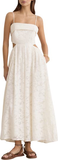 A foldover square neckline begins this intricate lace maxi dress with side and back cutouts that give it a cheeky edge.