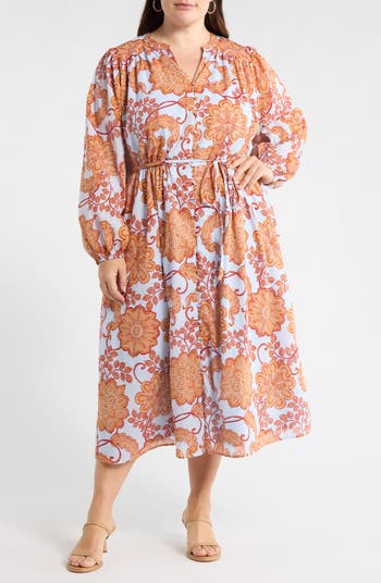 A full-length covered-button placket and billowy sleeves enrich the romantic styling of this cotton shirtdress patterned in a paisley-influenced floral print.