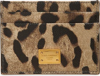 An engraved logo plate brands this leopard-print calfskin card case with ample slots to keep financial essentials organized.