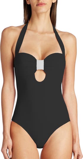 Retro-inspired silhouette featuring a bandeau sweetheart neck with a playful keyhole cut-out and soft padding for a sleek and comfortable fit.