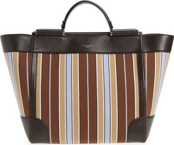 From the fashion house's iconic Sicily collection, this mixed-media tote boasting a structured and spacious silhouette mixes the richness of calfskin leather with crisply striped cotton-blend canvas.