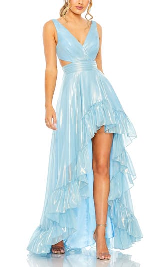 This striking dress features a sheer organza overlay, V-neck, side and back cutouts, and a dramatic ruffled high-low hemline, perfect for making a statement at special occasions.