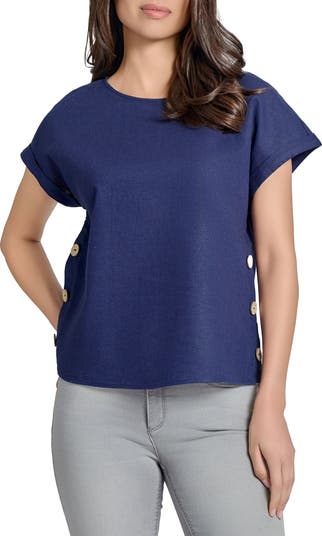 Cut from a lightweight linen-blend fabric, this versatile top is framed by cuffed sleeves and accented with a row of buttons on either side.