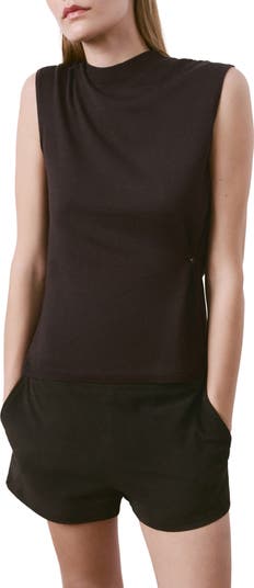 A gathered-and-buttoned side enhances the shape of this soft cotton-blend sweater-vest accented with a high neckline and fine ribbing.